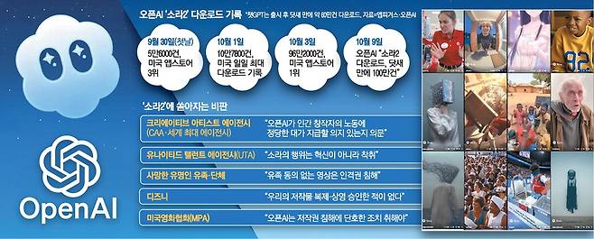 오픈AI가 선보인 영상 생성 인공지능(AI) '소라2(Sora 2)'가 미국에서 폭발적 인기를 끌며 새로운 디지털 현상을 만들어내고 있다. 닷새 만에 100만 다운로드를 돌파하며 '챗GPT'보다 빠른 속도로 성장하고 있지만, 동시에 저작권 침해와 딥페이크 확산 논란이 겹치면서 '혁신과 위험의 이중주'가 이어지고 있다.