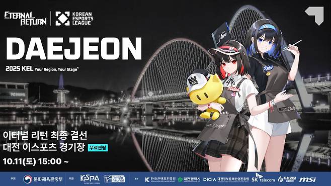 한편 '2025 KEL'은 올해 처음 출범한 지역 기반 이스포츠 리그로, 지역 선수 육성과 산업 활성화를 목표로 하고 있다. 부산, 광주, 경남, 대전 등 지역 이스포츠 경기장과 협력해 오프라인 대회를 개최하며 지역 경제 활성화도 함께 도모한다. 문화체육관광부가 주최하고 한국e스포츠협회, 크래프톤, 님블뉴런, 넥슨코리아가 공동으로 주관하며, 이터널 리턴 최종 결선은 한국콘텐츠진흥원, 대전광역시, 대전정보문화산업진흥원, SK텔레콤, 꾸브라꼬 숯불치킨, MSI가 후원한다. '이터널 리턴' 종목 총 상금은 5000만 원이다.