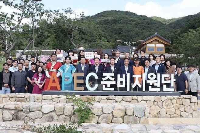 [서울=뉴시스] 정병혁 기자 = 김민석 국무총리가 10일 경북 경주시 APEC준비지원단을 찾아 현장 근무자들과 기념촬영을 하고 있다. (사진=국무총리실 제공) 2025.10.10. photo@newsis.com *재판매 및 DB 금지