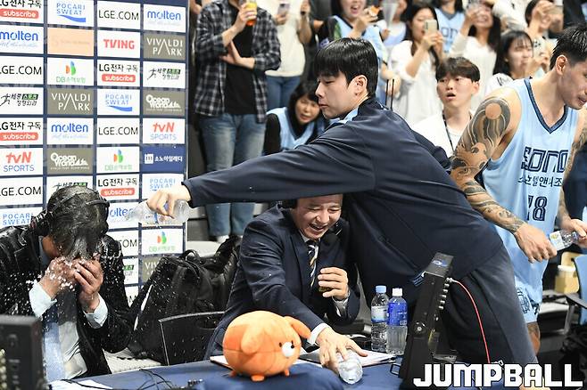 손창환 감독은 부임 후 첫 승을 이른 시기에 기록, 경기 종료 후 기분 좋은 물세례를 맞기도 했다.