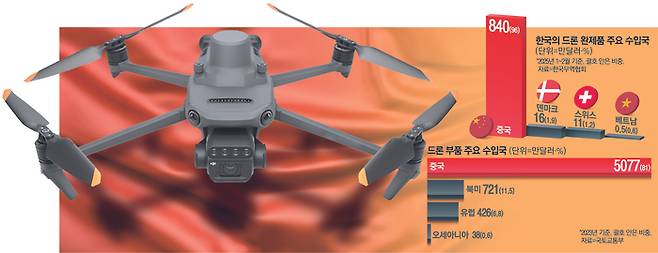 10일 매일경제가 국내 드론 공급망을 분석한 결과 완제품부터 부품에 이르기까지 중국산 의존도가 절대적인 것으로 드러났다. 한국무역협회 및 업계에 따르면 올해 1~2월 기준으로 원격조종 비행만 가능한 드론(최대 이륙 중량 250g 초과 7㎏ 이하)의 경우 중국산 규모가 839만6000달러에 달했다. 전체의 96%를 차지한 것이다. 반면 대중(對中) 드론 수출은 40만5000달러로, 드론 수출의 5.5%에 그쳤다.