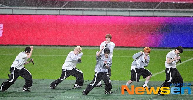 이날 보이그룹 투어스가 하프타임때 멋진 무대를 펼치고 있다.