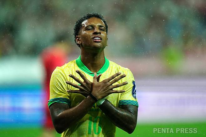 [ 펜타프레스 - 2025/10/10 ] 서울월드컵경기장에서 열린 대한민국과 브라질 축구 국가대표 평가전 경기에서 브라질의 호드리구가 41분 추가골 후 세레머니를 펼치고 있다.