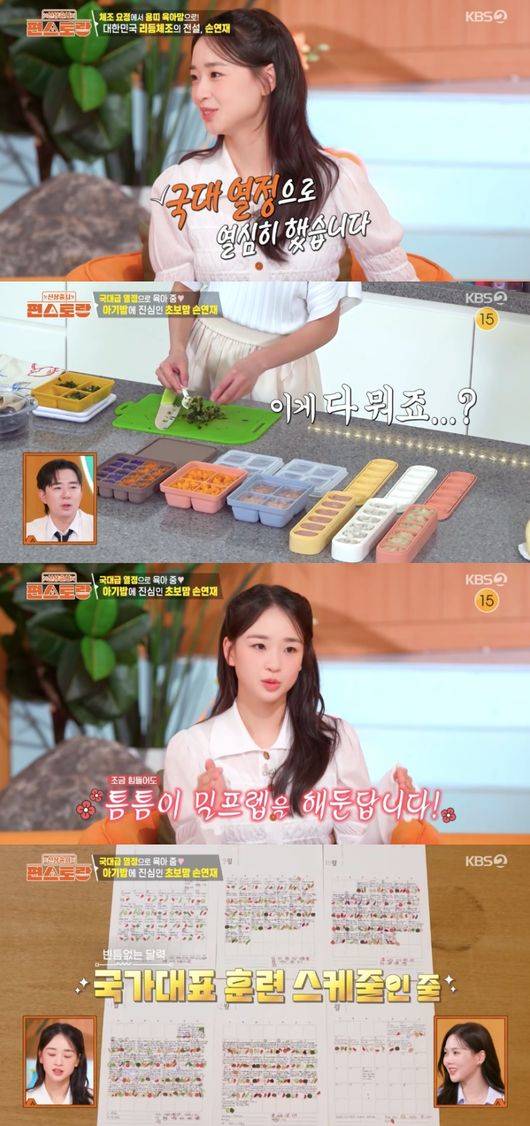 한편, 체조선수 시절 평생 식단관리를 해 온 손연재는 아들을 위해 골고루 음식을 만들고자 노력한다고 밝혔다. 그는 “은퇴 전까지 안 먹어본 식재료도 엄청 많고 음식에 대한 경험이 많이 없다. 편식을 너무 많이 한다”라고 말했다.