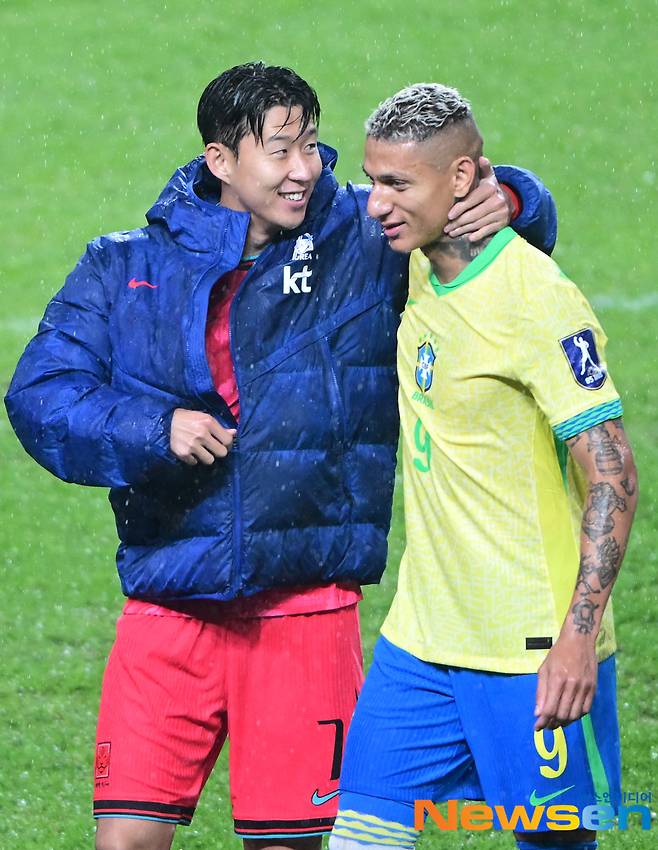 이날 브라질이 한국을 상대로 5-0 승리를 거뒀다 경기후 한국 손흥민과 브라질 히샬리송이 인사하고 있다