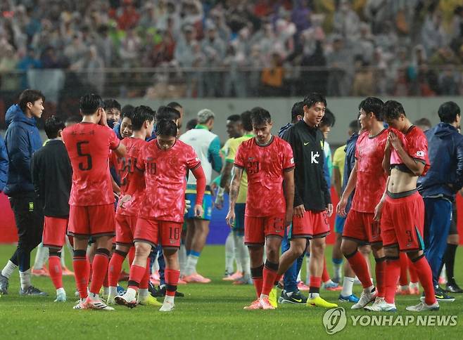 (서울=연합뉴스) 신현우 기자 = 10일 서울 마포구 서울월드컵경기장에서 열린 한국과 브라질 축구 대표팀의 친선경기. 0-5로 대패한 한국 선수들이 무거운 표정으로 그라운드를 나서고 있다. 2025.10.10