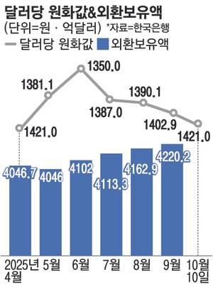 이런 가운데 이날 한국은행은 지난달 말 기준 우리나라 외환보유액이 4220억2000만달러(약 600조원)라고 밝혔다. 지난 8월보다 57억3000만달러 늘어난 것이다. 우리나라 외환보유액은 지난 5월 말 4046억달러로 약 5년 만에 최소 수준으로 줄었는데, 이후 4개월간 연속 증가세를 보이고 있다. 한은 관계자는 “운용 수익이 늘고 분기 말 효과로 금융기관의 외화예수금도 증가한 데 따른 것”이라고 설명했다. 한국의 외환보유액 규모는 8월 말 기준 4163억달러로 세계 10위 수준이다. 중국이 3조3222억달러로 가장 많았고, 일본(1조3242억달러), 스위스(1조222억달러), 인도(6954억달러), 러시아(6895억달러), 대만(5974억달러), 독일(4682억달러), 사우디아라비아(4564억달러), 홍콩(4216억달러) 등이 뒤를 이었다.