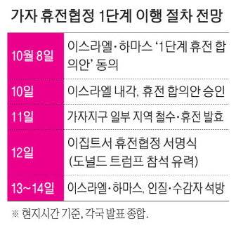 10~11일께 이스라엘군 철수·휴전 발효, 13~14일께 이스라엘·하마스 양측의 인질·수감자 석방이 이뤄지는 셈이다.