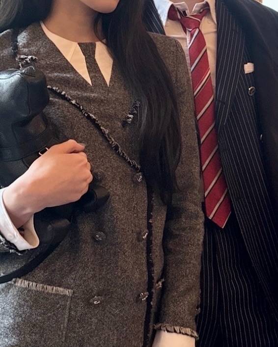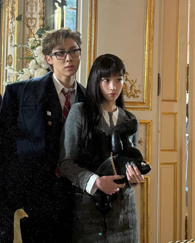 그는 같은 그룹의 우찬과 함께한 사진에서 트위드 재킷과 스커트 셋업, 셔츠를 매치한 클래식한 스타일로 눈길을 끌었다. 블랙 컬러의 강아지 인형 백을 든 모습은 감각적인 포인트가 됐다.