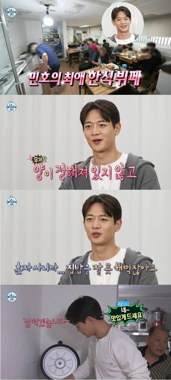 민호는 "매일 메뉴가 다르다. 자주 이용하는 이유 중 하나가 양이 정해져 있지 않고 혼자 사니까 집밥을 잘 못 해먹는다. 8천 원에 이렇게 푸짐하게 먹을 수 있다니 이만한 곳이 없다"고 한식뷔페 식당에 대한 애정을 보였다.