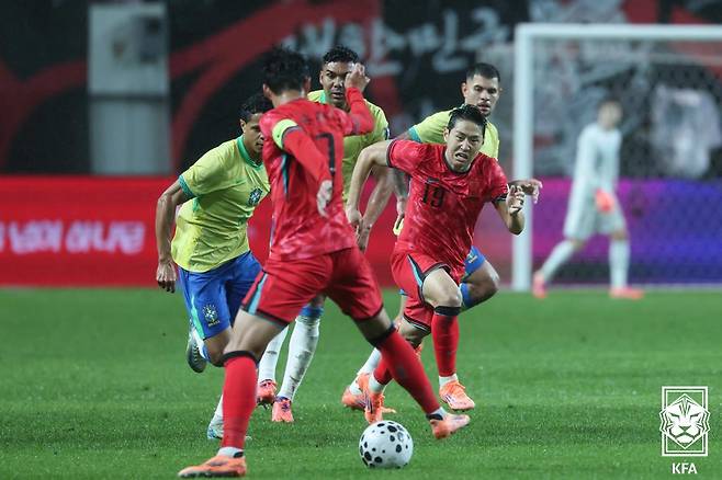 선수들에게 무슨 이야기를 전했는지 묻자, 홍명보 감독은 “전반전에는 좋았던 장면이 있었다. 공수에서 전방압박이 좋았다. 어느 시점부터 브라질 선수들의 개인 기량이 좋다 보니 압박하는 데 주저함이 보였다”라며 “상대에게 공간을 내주다 보니 공이 투입됐고, 수비수들이 어려움을 겪었다. 우리 선수들에게 괜찮다고 다독였다. 실점했지만, 신경 쓰지 말고 적극적으로 준비한 거 하자고 말했다”라고 이야기했다.