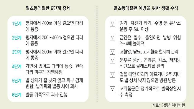 증세는 경중에 따라 6단계로 나뉜다. 1∼3단계는 다리 통증이 나타나기 시작하는 거리로 구분한다. 평지에서 400m 이상 걸었을 때 다리가 아프기 시작하면 1단계, 200∼400m는 2단계, 200m 이하는 3단계에 해당한다. 조 교수는 “움직일 때만 통증이 나타난다는 뜻에서 이 증세를 ‘간헐적 파행’이라고 부른다. 보통 환자들은 2단계부터 이상 신호를 알아챈다”고 했다.