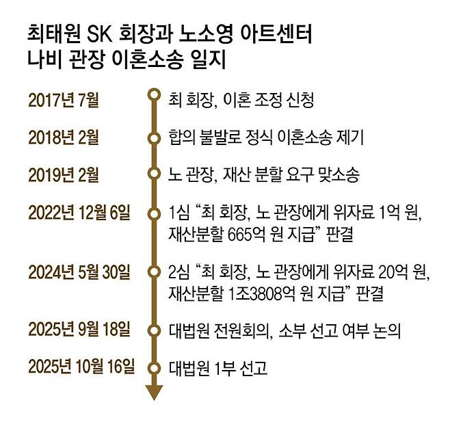 대법원 1부(주심 서경환 대법관)는 최태원 SK그룹 회장(65)과 노소영 아트센터 나비 관장(64)의 이혼 소송에 대한 선고 기일을 16일 오전 10시 진행한다.