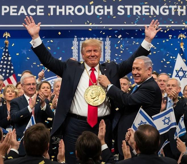 | 네타냐후 “트럼프, 노벨 평화상 자격 있다” 합성사진까지 이스라엘 총리실이 9일(현지 시간) ‘X’에 가짜 노벨상 메달을 목에 건 도널드 트럼프 미국 대통령(가운데)과 옆에서 미소 짓는 베냐민 네타냐후 이스라엘 총리의 합성 사진을 게재하며 “그(트럼프 대통령)는 (노벨 평화상을 탈) 자격이 있다”고 적었다. 사진 출처 이스라엘 총리실 X |