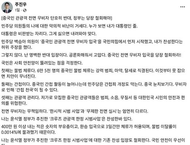 주진우 국민의힘 의원은 백승아 더불어민주당 원내대변인의 '중국인 관광객 전면 무비자 입국을 국민의힘에서 먼저 시작했다'는 지적에 대해 "내가 찬성한다는 허위 주장을 했다"고 반박했다. 이어 " 중국인 전면 무비자 입국을 당장 철회하라"고 입장을 밝히면서 "나는 윤석열 정부가 추진한 '크루즈 관광객 한정 시범사업'은 찬성한 바 있다. 400만 원 이상 내는 적은 숫자의 부유층이고 환승 입국으로 3일간만 체류가 허용되며, 불법 이탈률이 0.0014%에 불과했기 때문이다. 나는 윤석열 정부가 추진한 '크루즈 한정 시범사업'에 대한 기존 찬성 입장도 철회한다. 국민의 안전이 우선이다. 이재명 정부는 중국인 관광객 전면 무비자 정책을 철회하고 원점에서 재검토하라"고 압박했다. 사진=주진우 SNS 캡처