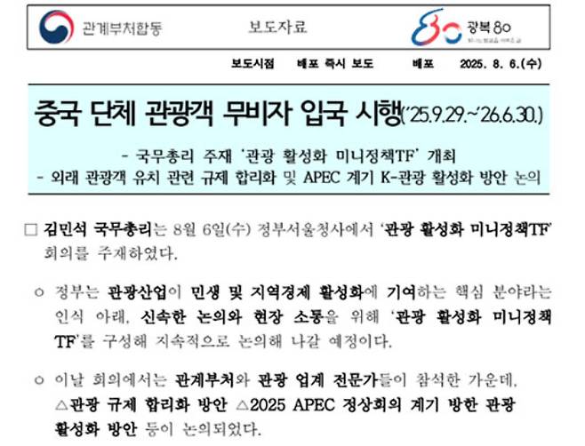 김민석 국무총리 주제로 '관광 활성화 미니정책TF' 회의를 열고 다음 달 29일부터 내년 6월30일까지 중국인 단체 관광객을 대상으로 무비자 입국을 허용하는 방안을 확정했다고 밝혔다. 중국은 지난해 11월부터 한국인의 무비자 입국을 허용했다. 이에 한국 정부도 중국인 단체 관광객을 대상으로 무비자 정책을 시행하기로 하고 관계 부처 간 협의를 진행 중이었다. 이날 국정기획위원회 규제 합리화 TF에서 이를 신속 추진 과제로 지정해 정부에 제안하기도 했다. 사진=법무부 제공