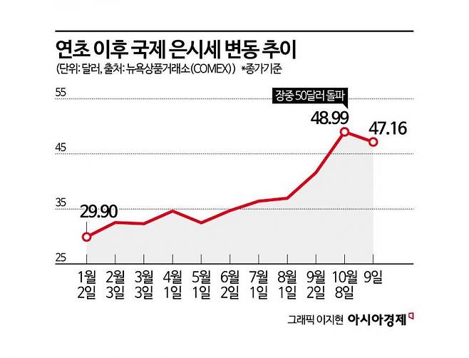 국제 은 가격은 지난 8일(현지시간) 1980년 1월 이후 45년만에 처음으로 장중 50달러선을 넘어섰다. 8일 뉴욕상품거래소(COMEX)에서 은 가격은 장중 한때 1온스당 50.224달러를 기록했다. 이후 차익실현 매물이 나타나면서 48.99달러에 장을 마쳤다. 연초 29.90달러 대비 64% 이상 가격이 오른 것이다.