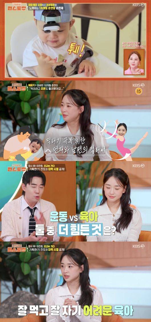 심지어 손연재는 “아들이 너무 안 먹어서 제가 리본도 돌려봤다. 한쪽에서 제가 돌리고 있고, 남편이 밥을 먹였다”라고 고백해 폭소케 했다.
