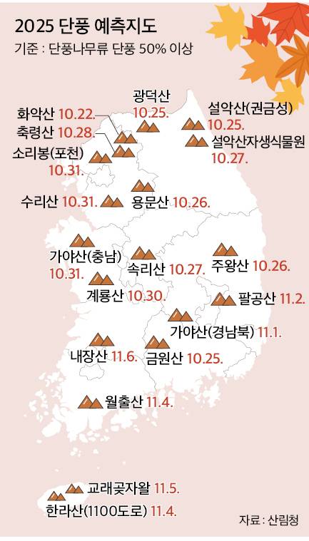 단풍 절정 시기는 최근 10년간과 비교해 4∼5.2일 늦어졌다. 이번 예측은 국립수목원과 전국 권역별 공립수목원 9개소, 국립산림과학원이 협력해 수집한 생물계절 장기 관측자료와 산악기상정보를 종합해 산출됐다.