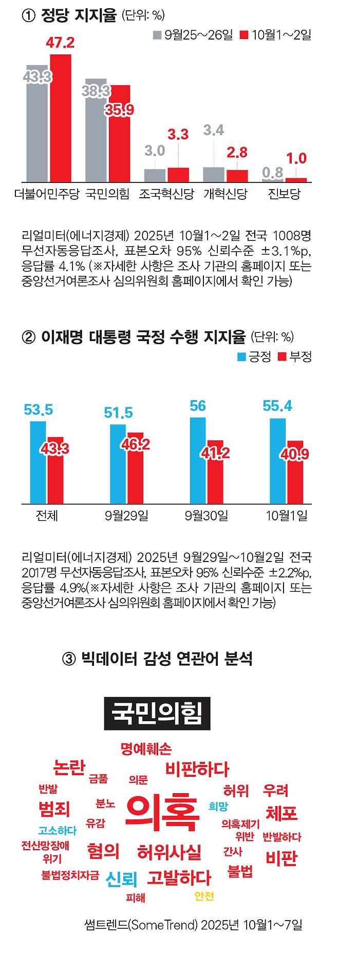 그렇다면 여권에 넘쳐나는 악재 속에서 국민의힘 경쟁력은 상대적으로 높아지고 있을까. 그렇지 않다. 일종의 아이러니다. 리얼미터가 에너지경제신문의 의뢰를 받아 10월1~2일 실시한 조사(전국 1008명 무선자동응답조사, 표본오차 95% 신뢰수준에 ±3.1%p, 응답률 4.1%. 중앙선거여론조사심의위원회 홈페이지 참조)에서 '어느 당을 지지하는지' 물어본 결과 민주당 47.2%, 국민의힘 35.9%, 조국혁신당 3.3%, 개혁신당 2.8%, 진보당 1.0%로 집계됐다. 민주당 지지도는 전주 대비 3.9%p 올랐다. 국민의힘은 2.4%p 하락했다. 양당 지지율 격차는 지난주 5.0%p에서 11.3%p로 벌어지면서 3주 만에 오차범위 밖 수치를 나타냈다(그림①). 악재가 많은 여권이지만 지지율은 '지지층 결집'으로 더 올라갔고 반면 국민의힘은 정치적 반사이익을 얻지 못하고 주저앉았다.