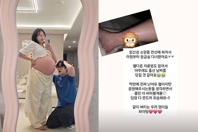 그는 "별다른 치료법이 없어 출산 날짜를 조금 앞당길 것 같다"며 "막판에 진짜 난이도 '헬'이지만 응원해주시는 분들 생각하면서 조금만 더 버텨보겠다. 답장 다 못 드려 죄송하다. 같이 버티는 우리 엄마들 파이팅"이라고 덧붙였다.