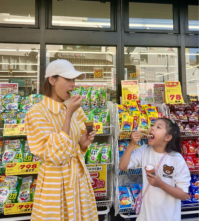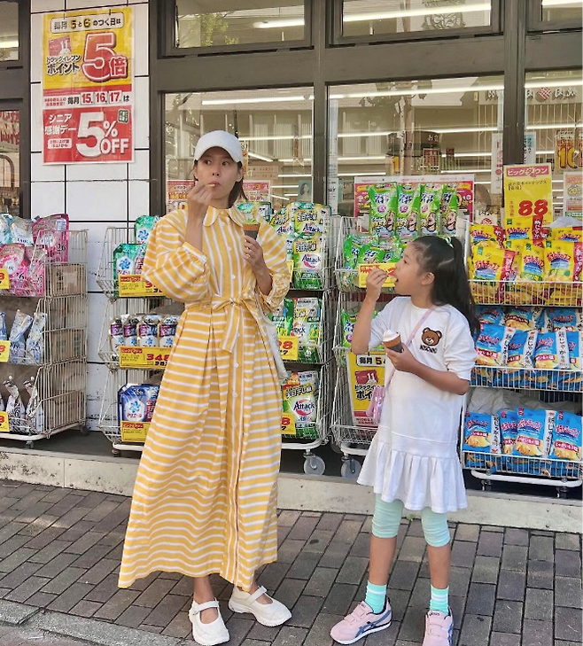 공개된 사진 속 조윤희는 노란색 스트라이프 롱셔츠 원피스를 입고 아이스크림을 먹으며 여유로운 시간을 보내고 있다. 옆에는 딸 로아가 하얀 원피스에 민트색 레깅스를 매치한 사랑스러운 모습으로 함께 서 있다.