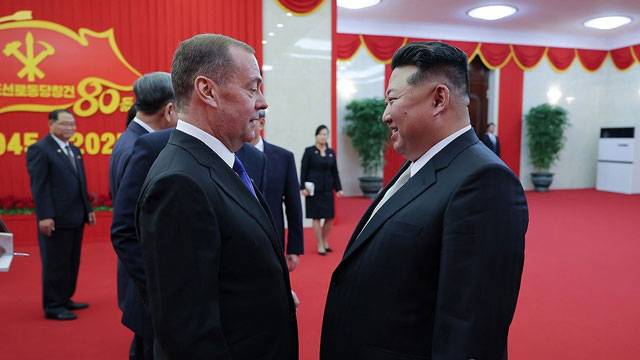 김정은 북한 국무위원장이 노동당 창건 80주년 기념행사 참석차 방북한 드미트리 메드베데프 러시아 국가안보회의 부의장 겸 통합러시아당 의장을 접견하고 동맹관계 발전방안을 논의했습니다.