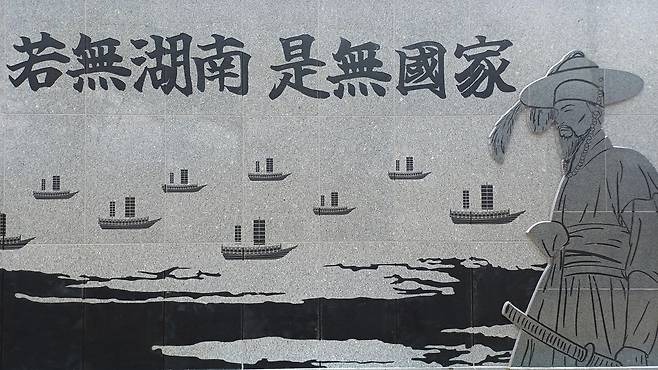 | ▲ 이순신과 약무호남 시무국가. 열선루 아래 벽면을 장식하고 있다. |