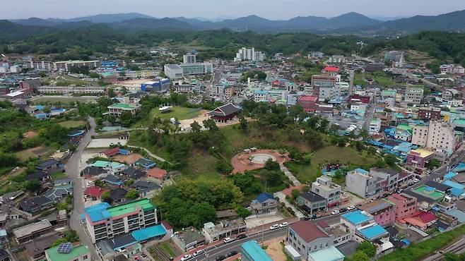 | ▲ 하늘에서 본 보성읍 전경. 신흥동산에 들어선 열선루가 읍내 한가운데에 자리하고 있다. |