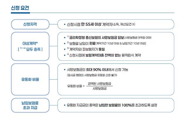 또 사망보험금이 9억원 이하여야 하고 금리확정형 종신보험만 가능합니다. 변액보험이나 금리연동형 상품은 해당하지 않는다는 이야기예요. 그리고 계약자와 피보험자는 동일해야 하고 신청시점에 보험계약대출 잔액이 없어야 합니다.