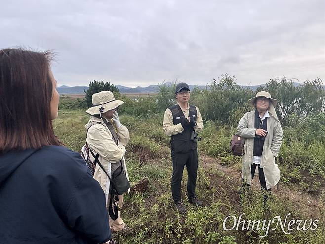 | ▲ 11일 오전 경기 안산시 시화호 대송습지에서 진행된 생물다양성탐사에서 최순규 박사(왼쪽에서 세 번쨰)가 설명하고 있다. |