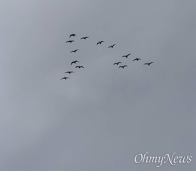 | ▲ 11일 오전 경기 안산시 시화호 대송습지 인근 상공으로 큰기러기들이 날아가고 있는 모습. |