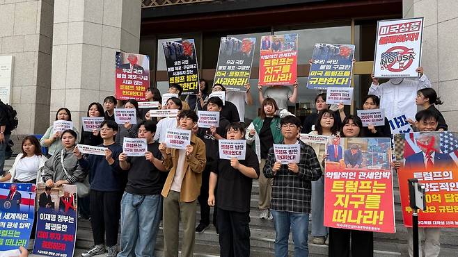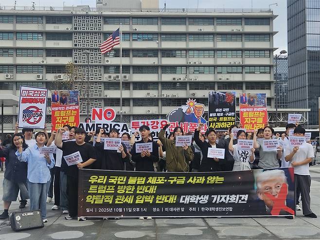 | ▲ 한국대학생진보연합(대진연) 회원 40여 명이 11일 낮 1시, 미 대사관 앞(광화문 광장)에서 ‘우리 국민 불법 체포?구금 사과 않는 트럼프 방한 반대! 약탈적 투자 강요 반대! 대학생 기자회견’을 열었다. |