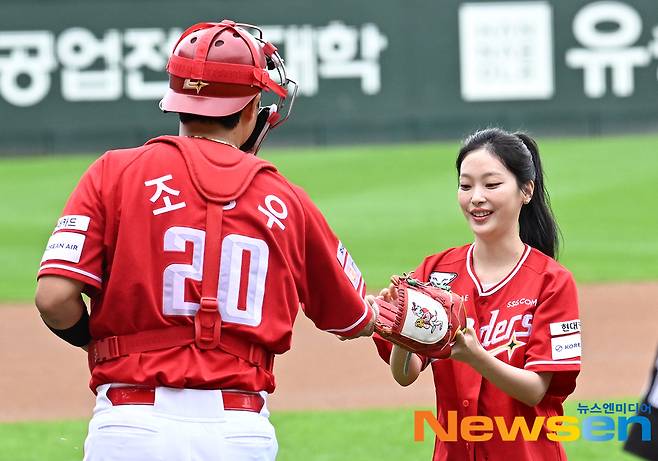 이날 배우 최희진(오른쪽)이 경기에 앞서 시구를 한 뒤 SSG 포수 조형우에게 기념구를 받고 있다.
