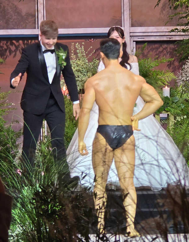 식이 한창 진행되던 중, 하객으로 참석한 홍석천이 깜짝 무대에 오르며 예상을 뛰어넘는 ‘웃음 폭탄 퍼포먼스’를 펼쳤다. 홍석천은 근육질 트레이너와 함께 ‘보석함 콘셉트 퍼포먼스’를 선보이며 등장, 결혼식장을 단숨에 폭소의 도가니로 만들었다.