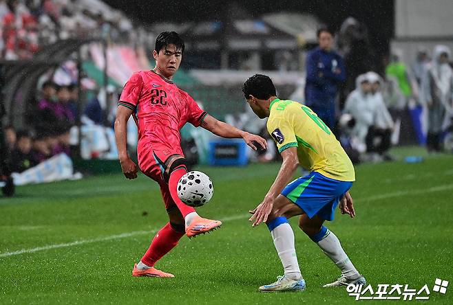 홍명보호는 브라질전에서 3-4-3 포메이션을 들고 나왔다. 중원에 황인범(페예노르트), 백승호(버밍엄 시티), 단 두 명의 미드필더들이 상대의 강한 압박을 받기 때문에, 중앙 수비수들의 빌드업 역량이 무엇보다 중요하다. 공의 전진을 위해서는 윙백들이 수비는 물론 공격에서도 활발하게 제 몫을 해야 한다.