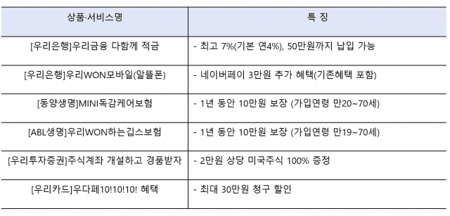 우리금융그룹이 적금·보험 등 금융상품 가입 시 우대금리를 주거나 포인트를 제공해주는 '우리금융 다함께 페스타(우다페)'를 13일부터 이달 말까지 우리원(WON) 뱅킹 애플리케이션(앱)에서 진행한다.