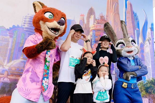 [서울=뉴시스] 추상철 기자 = 지난 11일 서울 여의도공원에서 열린 ‘디즈니런 서울 2025’에서 캐릭터 '닉'과 '주디'가 참가자와 기념촬영을 하고 있다. (사진= 디즈니코리아 제공) 2025.10.12. photo@newsis.com *재판매 및 DB 금지