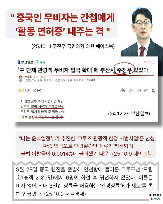 주 의원은 "나는 윤석열 정부가 추진한 '크루즈 한정 시범사업'에 대한 기존 찬성 입장도 철회한다"며 "이재명 정부는 중국인 관광객 전면 무비자 정책을 철회하고 원점에서 재검토하라"고 촉구했습니다.