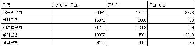 하나은행의 올해 가계대출 증가액은 8천651억원, KB국민은행은 1조7천111억원으로 각각 목표 대비 95%, 85% 수준까지 찼다.
