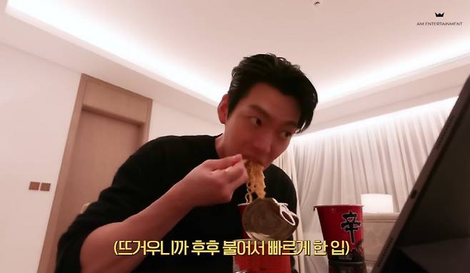 라면이 완성되자 그는 김치를 척 얹고 젓가락을 들며 "아... 이거지"라고 감탄해 눈길을 끌었다.