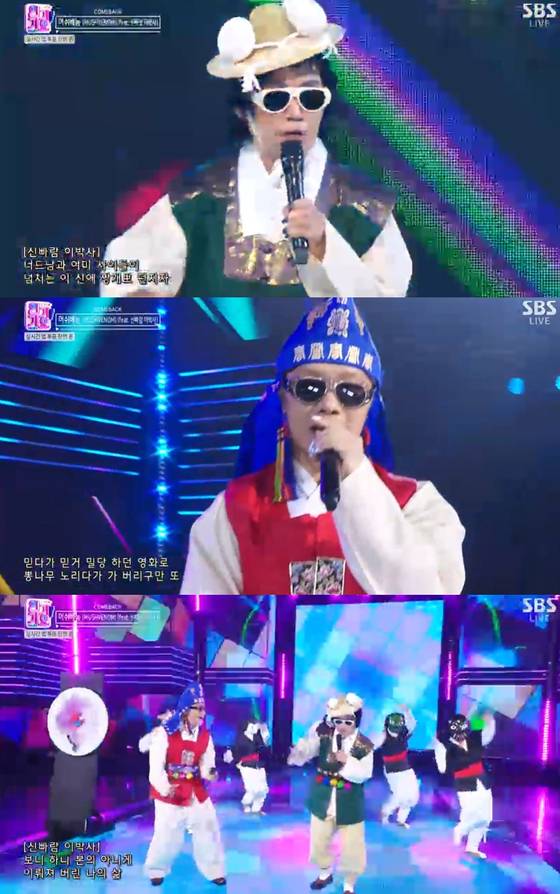 머쉬베놈은 12일 오후 방송된 SBS '인기가요'에 출연해 첫 정규앨범 '얼'의 타이틀곡 '돌림판 (feat. 신빠람 이박사)'을 선보였다.