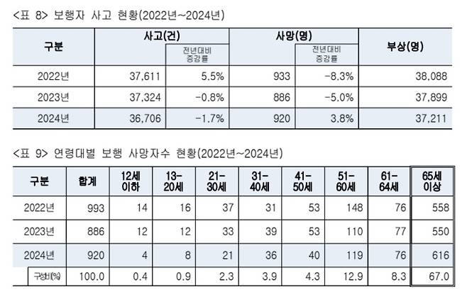 | ▲ 보행자 사고 현황 및 연령대별 보행 사망자수 현황 (2022 - 2024) 한국도로교통공단의 2025년 5월 보도자료에 따르면, 2022년부터 2024년까지 보행자 사고는 감소했지만 사망자는 증가했다. 0 - 60세까지 연령이 증가할수록 사망자수도 증가한다. 61 -64세의 경우 사망자수는 51 -60세보다 적지만 사망자수는 감소하지 않는다. |