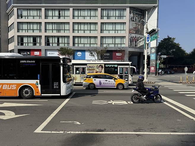 | ▲ 대만 타이중의 횡단보도 정지선 대만은 차량 정지선과 오토바이 정지구역이 동시에 존재한다. 횡단보도 기본 정지선과 오토바이 정지구역을 어기는 차는 일주일의 여행기간 동안 한 번도 관찰하지 못했다. |