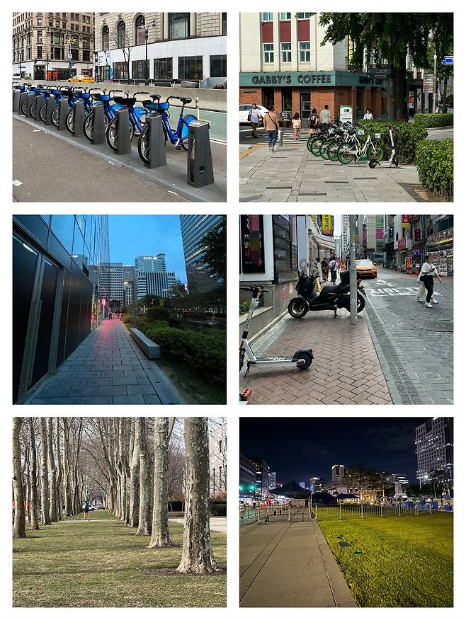 | ▲ (좌) 보행자를 위한 길 (우) 보행자를 배려하지 않는 길 (좌) 위에서부터 순서대로 뉴욕의 자전거 주차장, 종로의 보행로, 필라델피아의 산책로. 자전거가 인도를 침해하지 않고, 인도에는 보행을 방해하는 시설물이 없다. (우) 종로의 자전거 주차장, 명동의 인도, 광화문 광장. 인도를 침해하는 자전거 주차장, 인도를 가로막고 있는 오토바이, 펜스로 둘러싸인 광장의 보행로다. |