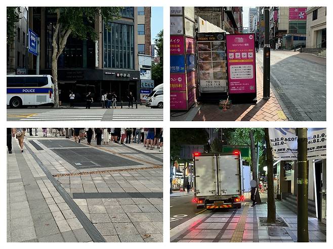 | ▲ 걷기 좋은 거리라 할 수 없는 서울의 모습 왼쪽 상단부터 시계방향으로, 지켜지지 않는 정지선, 인도를 점령한 간판, 안전장치가 없는 환풍구, 인도를 주차장으로 트럭 |