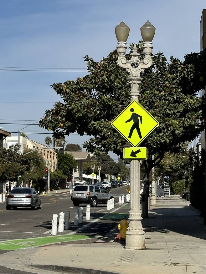 | ▲ 미국 산타모니카의 자전거 전용도로 차도, 인도와 정확하게 구분하고 있다. 차로부터 자전거를 보호하기 위한 경계물이 있어서 보행자의 경우 이중으로 보호받는다. |