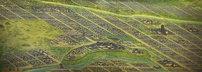 | ▲ 황성도(皇城圖) 삼국통일 전후의 전성기 서라벌을 그린 황성도. 월성과 대릉원, 황룡사가 랜드마크(Land Mark)처럼 우뚝하다. 방리제(坊里制)로 구획한 격자형 가로망이 정연하다. 삼국유사가 대도시 서라벌의 위용을 묘사했다. |