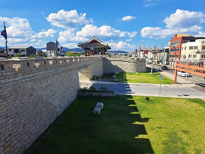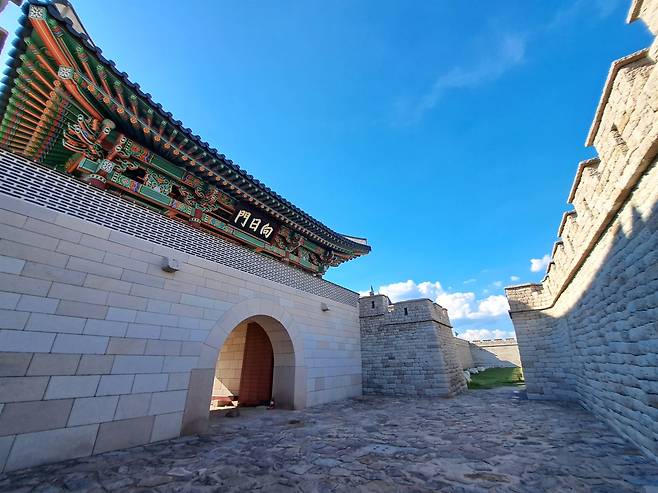 | ▲ 향일문과 경주읍성 2018년 복원된 경주읍성의 동쪽 성벽과 동문. 옹성 안의 동문이 고려 말 건립 당시 얻은 동문의 이름, 향일문이란 현판을 달고 있다. |
