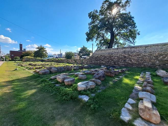 | ▲ 경주읍성(동벽) 2018년 복원 후 더는 복원이 막힌 경주읍성 동남쪽 끄트머리 성벽. 성벽으로 쓰인 돌들을 같이 전시해, 성벽에 쓰인 옛 서라벌의 흔적을 찾아 볼 수 있다. |